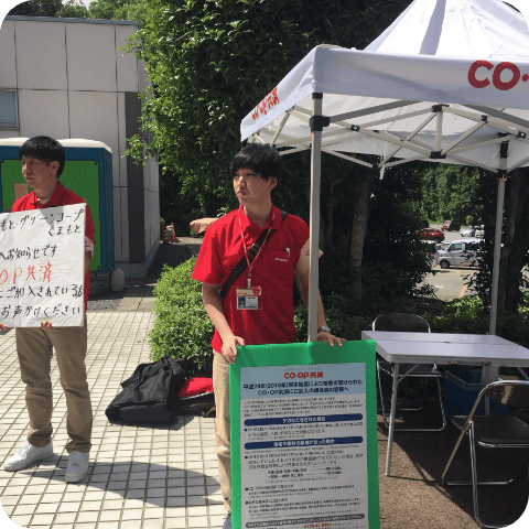 東日本大震災で被災されたCO・OP共済契約者のみなさまに共済金や見舞金をご案内するため、全国の64の生協から生協職員が被災地に集まり、訪問活動を行いました。活動では、組合員のお宅を訪問、避難所にもブースを設置し、共済金・見舞金の迅速な支払い手続きを案内しました。