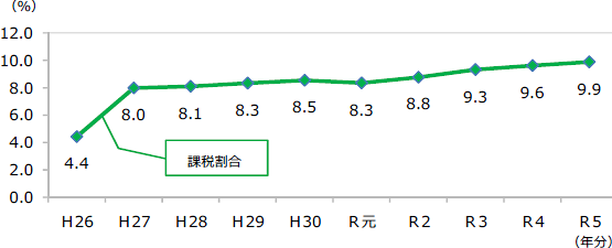 【相続税の課税割合(亡くなった人に占める課税対象者の割合)の推移】