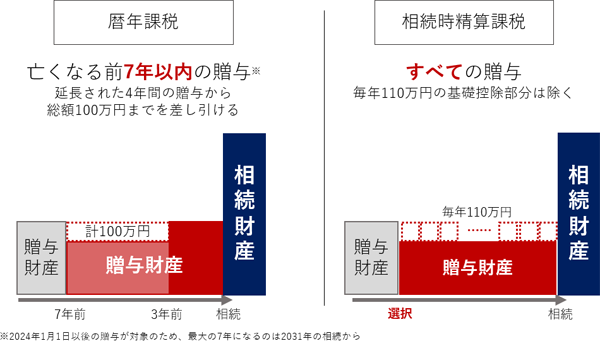 - 相続で財産を取得した人への相続開始前3~7年以内の贈与は、毎年110万円の基礎控除額部分を含めて相続財産に加算され、相続税の課税対象になる(加算される年数は順次延長され、最大の7年になるのは2031年の相続から。なお、改正により延長された4年間の贈与から、総額100万円までを差し引ける)