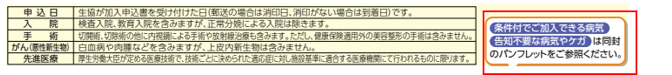 「条件付で加入できる病気」「告知不要な病気やケガ」(P3:新社会人コース加入申込書記入例)